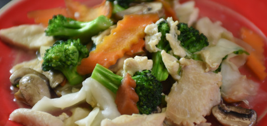 All white meat chicken, cabbage, mushrooms, broccoli, and carrots in a hand-made white sauce.